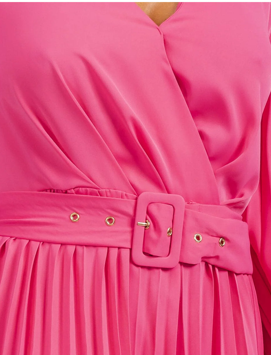 WOMEN'S LONG SLEEVE OPEN BACK SURPLICE BELTED PLEATED MAXI DRESS